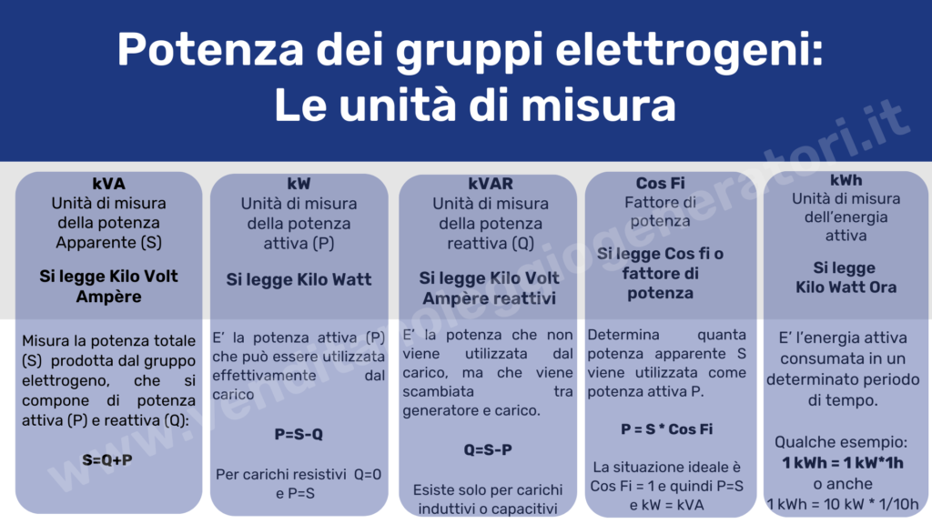 In questa tabella abbiamo riassunto i concetti sopra espressi, aggiungendo anche una colonna relativa ai kWh, che formalmente sono l’unità di misura dell’energia e non della potenza, ma non sono rare le richieste di clienti che ci chiedono informazioni riguardo i gruppi elettrogeni commettendo l’errore di chiedere la potenza in kWh, magari dopo aver controllato l’energia consumata in bolletta.