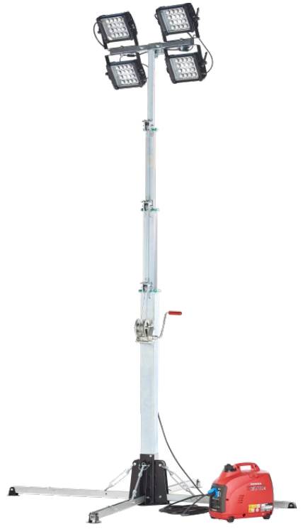 Torre faro a LED 2x160W, altezza massima 7 metri. Sollevamento manuale, area illuminata 1.800 metri quadrati, flusso luminoso 40.700 Lumen.