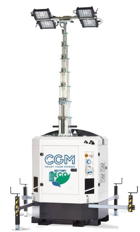 Torre faro a LED 4x160W con batterie e carrello – altezza 8.5 metri – sollevamento idraulico – CGM OKB4-160L